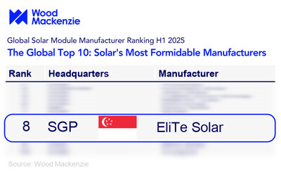 SINGAPORE, Dec. 18, 2025 /PRNewswire/ — Recently, leading global energy research and consultancy firm Wood Mackenzie released its Global Solar Module Manufacturer Ranking H1 2025. ELITE Solar once again secured a position on this prestigious global ranking, placing eighth worldwide in the first half of 2025—further reaffirming its comprehensive competitiveness as recognized by an international authority.