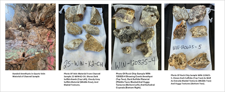 Field mapping confirmed that mineralization at Winston is hosted within a low-sulfidation epithermal gold-silver vein system, characterized by fissure-filling quartz veins and classic epithermal textures, including bladed quartz, comb quartz, colloform banding, vugs, and amethyst, indicative of boiling zones associated with precious metal deposition.