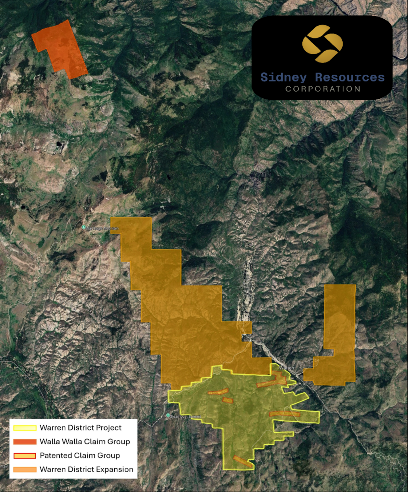 Figure 1 – Warren District Consolidated Land Position. Updated land position map highlighting Sidney Resources Corporation’s dominant footprint in the Warren Mining District.