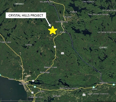 - Acquisition of 100% interest of the Crystal Hills Project, located in Clarkson Township, Ontario, Canada, approximately 40 km as the crow flies north of the city of North Bay. The project consists of five mineral claims comprised of eighteen (18) cells totalling approximately 400 hectares. (see Figure 1 below);