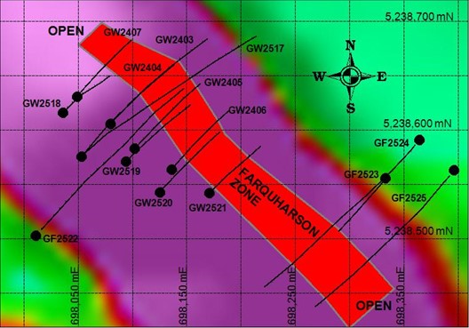 The Company drilled 10 holes of NQ size core for a total of 2,603 meters in the 2025 Goodwin drilling campaign including one hole on the Granges Zone and nine holes on the Farquharson Zone. Drilling extended the strike length of the Farquharson Zone to 360 meters and the Zone is open in both directions. (see Figure 2).
