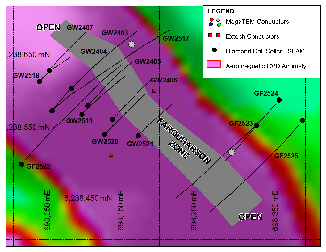 The Company completed 10 holes of NQ size core drilling for a total of 2,603 meters in the 2025 Goodwin drilling campaign. This included one hole on the Granges Zone and nine holes on the Farquharson Zone. The strike length of the Farquharson Zone was extended to 360 meters and is open in both directions as shown on Figure 2.