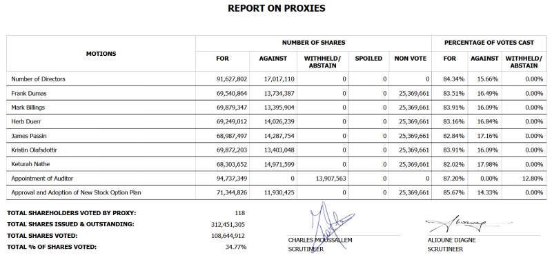 Les scrutateurs de Computershare Investor Services Inc. ont indiqué que les votes exprimés lors de l’assemblée, en personne ou par procuration, représentaient un total de 108 644 912 actions, soit 34,77 % des 312 451 305 actions en circulation de St-Georges Eco-Mining Corp.