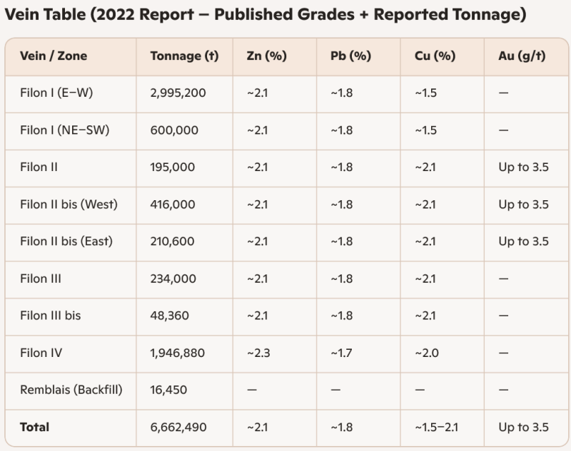 The historical estimate reports a total of approximately 6.62 million tonnes of mineralized material across multiple veins (Filons I, II, II bis, III, IV, and associated structures). The report indicates average grades across the total tonnage in the range of ~2–5% Zn, ~1–3% Pb, and ~0.5–1% Cu, with silver and gold present in trace to moderate concentrations. Certain localized zones within individual veins were reported with significantly higher grades (Zn > 10%, Pb > 7%, Cu > 2%, Ag > 100 ppm, Au > 4 ppm), but these are not representative of the overall historical estimate.