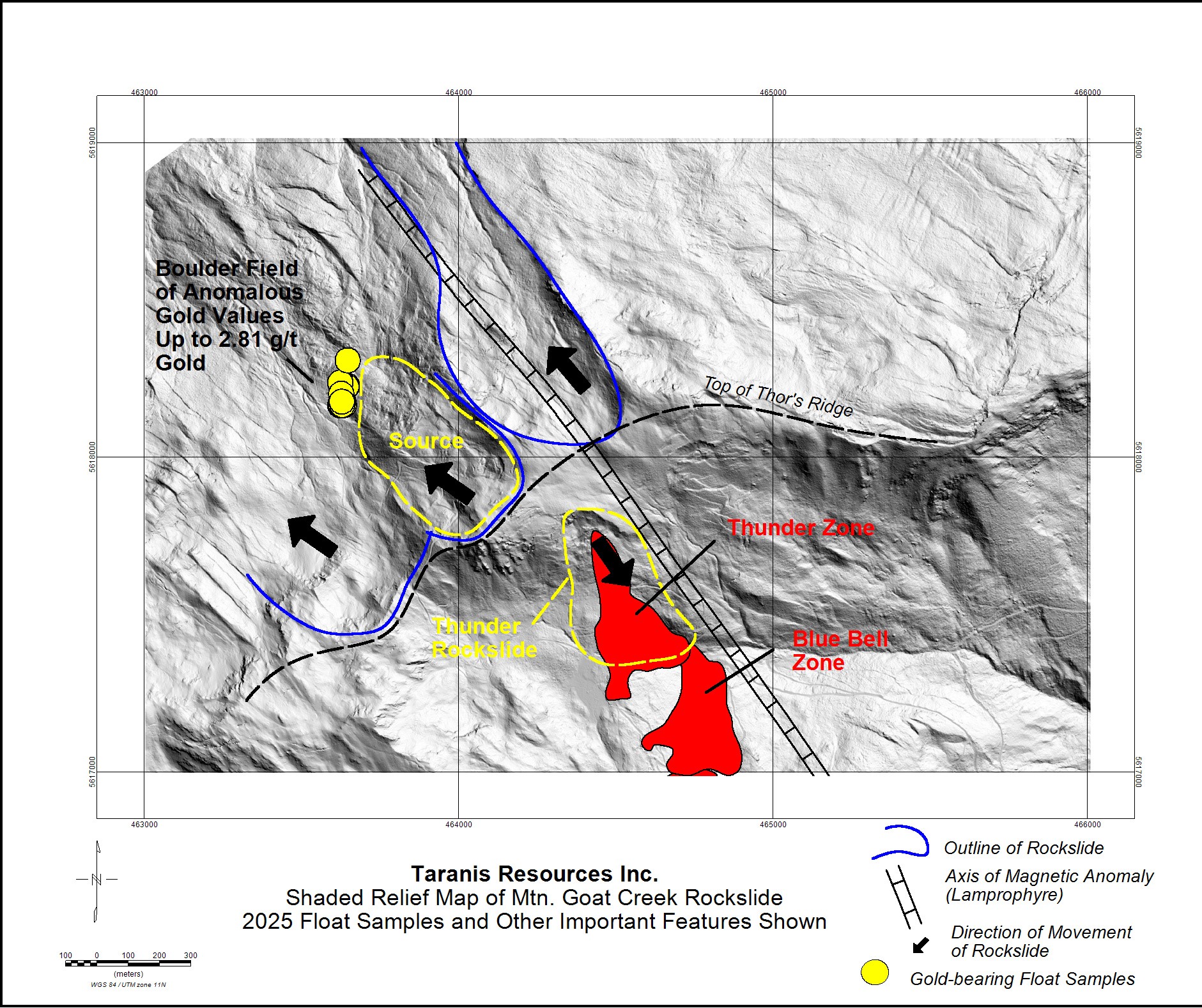 Taranis has never conducted any drilling north of Thor’s Ridge. The gold-bearing boulder field is located about 1 km north of the top of Thor’s Ridge and measures approximately 150 x 50m. Although the source of these gold-bearing boulders is not currently known, they clearly have origins under the Mountain Goat Creek Rockslide. All of the float samples are from quartz-carbonate vein material, and they were only analyzed for gold.