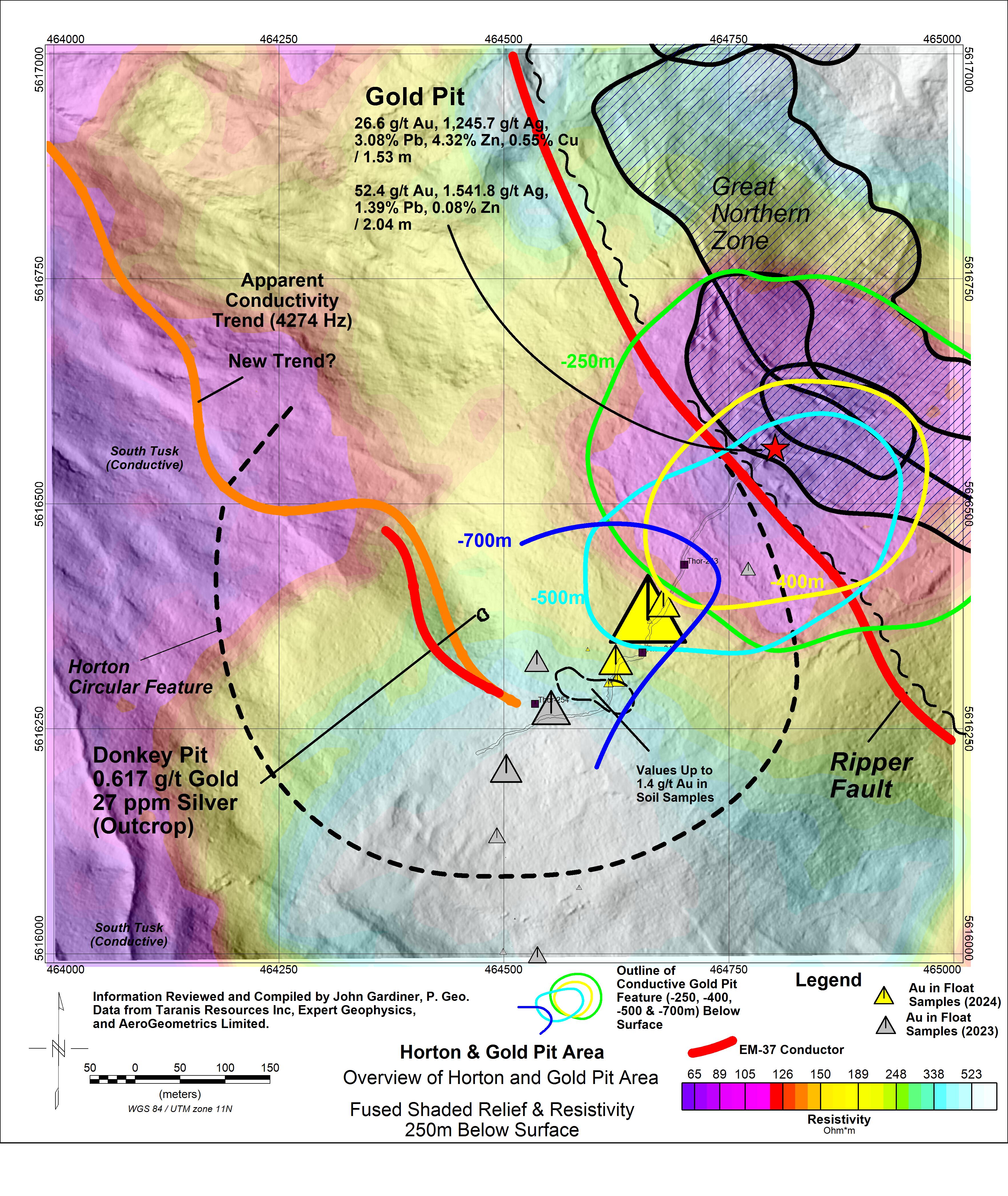 Gold Pit is an extremely high-grade prospect that lies on the east side of the Horton Valley, and lies at the transition from the Thor epithermal vein area to the Horton area. Some of the sampling results are discussed in prior News Releases (January 14, 2015 and November 14, 2017) and include channel samples of 26.6 g/t Au, 1,245.7 g/t Ag, 3.08% Pb, 4.32% Zn and 0.55% Cu over 1.53 m true thickness, and 52.4 g/t Au, 1,541.8 g/t Ag, 1.39% Pb and 0.08% Zn over 2.04 m true thickness. The Expert Geophysical magnetotelluric survey identified a circular (500m by 500m) conductive body that extends from near surface to 700m depth directly under Gold Pit. At a depth of 700m below the surface, the conductive feature merges onto the South Tusk conductivity feature under the Horton Area. This feature has never been tested with diamond drilling, and is now rated a high priority for further exploration.