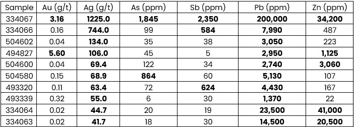 Widespread elevated pathfinder elements and alteration signatures, such as anomalous arsenic, antimony, lead and zinc, which are commonly associated with epithermal gold-silver systems.