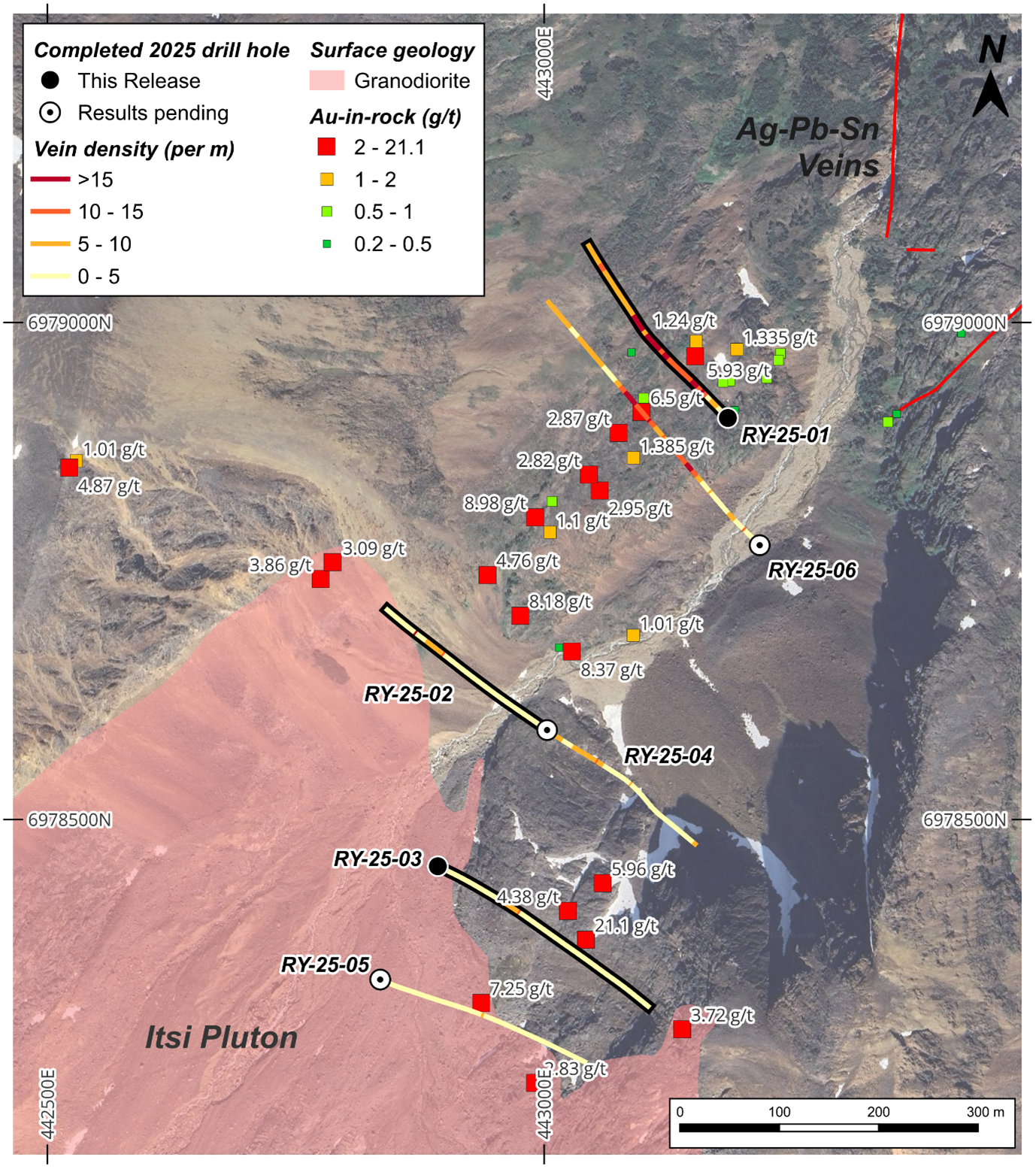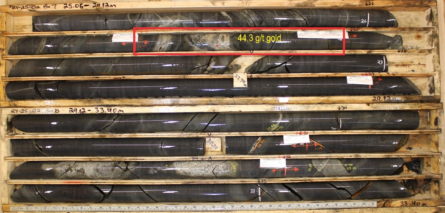 Drill hole RY-25-02 intersected 44.3 g/t gold over 0.58 metres.