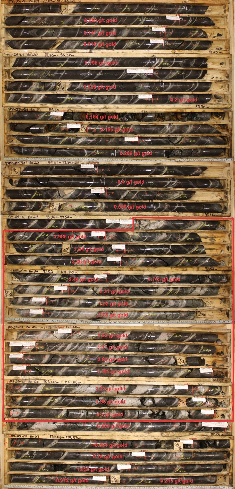 Photo 1 – Drill core from hole RY-25-01, 77.08 to 114.53 m annotated with individual sample results. Highlighted interval grades 1.98 g/t gold over 14.99 m.