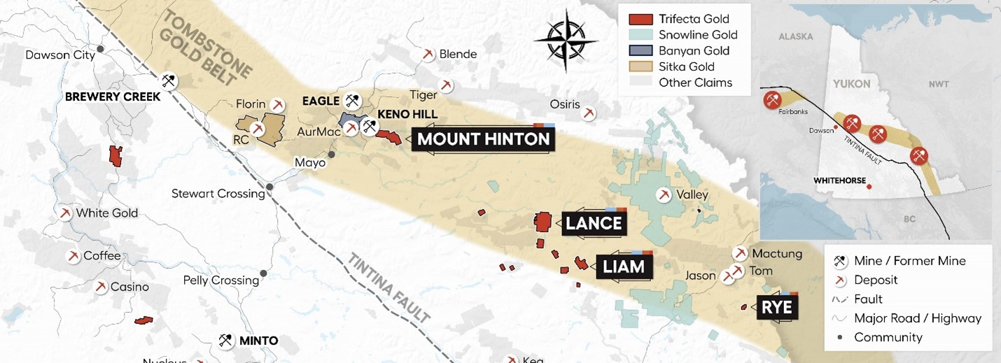 Trifecta is a Canadian-based precious metals exploration company dedicated to increasing shareholder value through the discovery and development of 100% held gold projects in Yukon and Nevada. Trifecta has secured an option to acquire a 100% interest in Mt. Hinton, Rye and 9 other highly prospective, intrusion-related gold projects located in Yukon’s Tombstone Gold Belt where over 17 million ounces of gold have been discovered since May 2020. Initial drilling at the Company’s Yuge Gold Project, located in northern Nevada, has identified multiple broad zones of gold mineralization near historical high-grade mines. The Company’s Eureka Project hosts an 8 x 2.5 kilometre belt of surface showings and anomalous gold-in-soil that straddle the headwaters of two of the most productive placer creeks in Yukon’s southern Klondike Goldfields. Trifecta’s Treble Project covers a large hydrothermal system, located midway between Western Copper and Gold Corporation’s Casino Deposit, the largest copper and gold deposit in the Yukon, and Rockhaven Resources Ltd.’s Klaza Deposit, a high-grade gold-silver deposit.