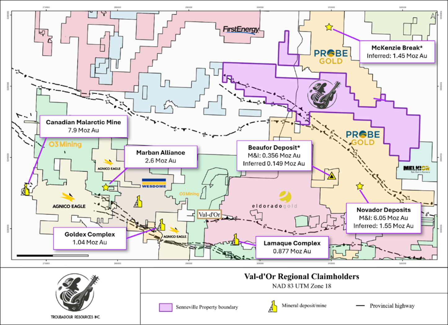 Comprising 212 mineral claims totalling about 119.5 km2, Senneville property is located within the prolific Val d’Or Mining Camp between Probe Gold’s McKenzie Break deposit (1,452,261 ounces Inferred1) to the north and the Probe’s Novador Development Project to the south (6,405,000 ounces M&I and 1,550,200 ounces Inferred2).