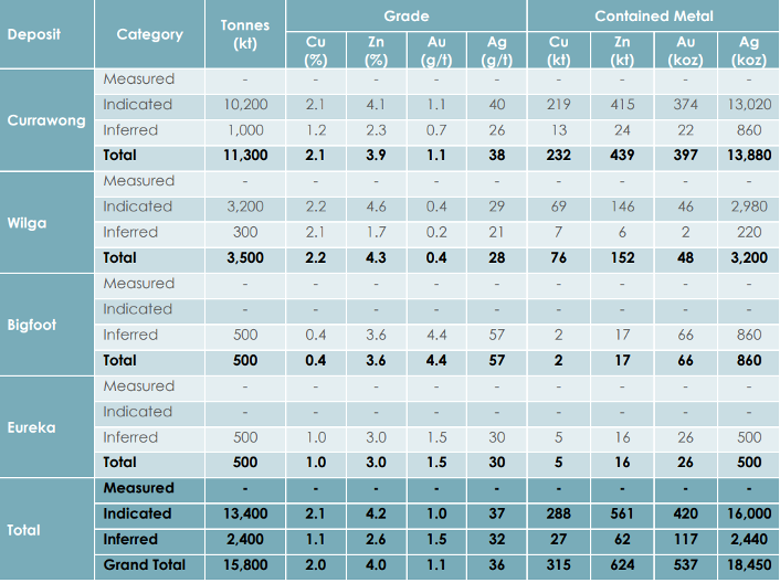 Current total resource as of Dec 31, 2024 comprises 13.4Mt @ 2.1% Cu, 4.2% Zn, 1.0g/t Au Indicated and 2.4Mt @ 1.1% Cu, 2.6% Zn, 1.5g/t Au Inferred.