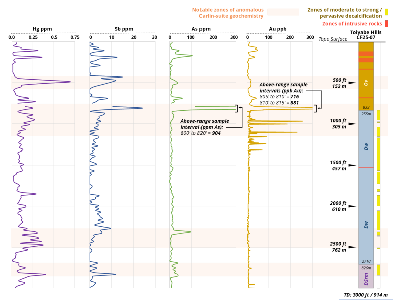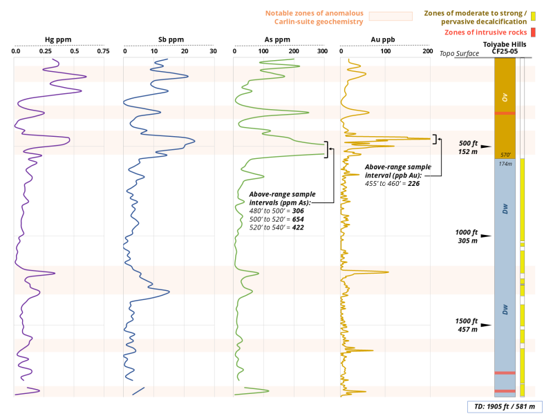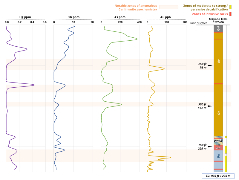 CF25-05 encountered an 80-metre-thick interval near the bottom of the hole characterized by pervasive decalcification, quartz veining and/or selvages of silicification, shearing (blind thrust with graphitic, elliptical chips), multiple sulfidized dikes, and increased amounts of sooty sulfides including quartz-sooty pyrite stringers to stockworks. This hole also returned elevated gold, arsenic, antimony and mercury around the Roberts Mountains Thrust (4.6m of 0.17 g Au/t).