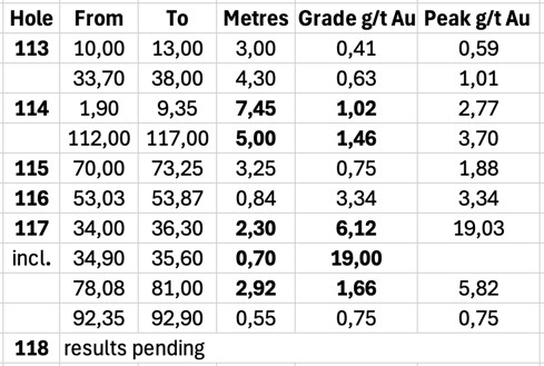 - Hole CJO 114, drilled outside the current resource, returned 7.5m @ 1.02g/t gold from 1.9m depth and 5m @ 1.46g/t gold from 112m depth, confirming that mineralization extends beyond the existing resource boundaries.