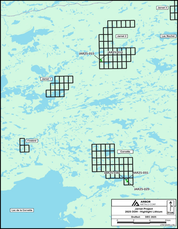 Vancouver, Canada – TheNewswire – January 15th, 2026 – Arbor Metals Corp. (“Arbor” or the “Company”) (TSXV: ABR, FWB: 432) is pleased to announce assay results from its 2025 Phase 3 diamond drilling program at its wholly owned Jarnet Lithium Project, located in the Corvette Lake Lithium Camp, Eeyou-Istchee Baie-James territory in the Quebec North region. Anomalous lithium was encountered on the Jarnet 2 and Corvette claim blocks.