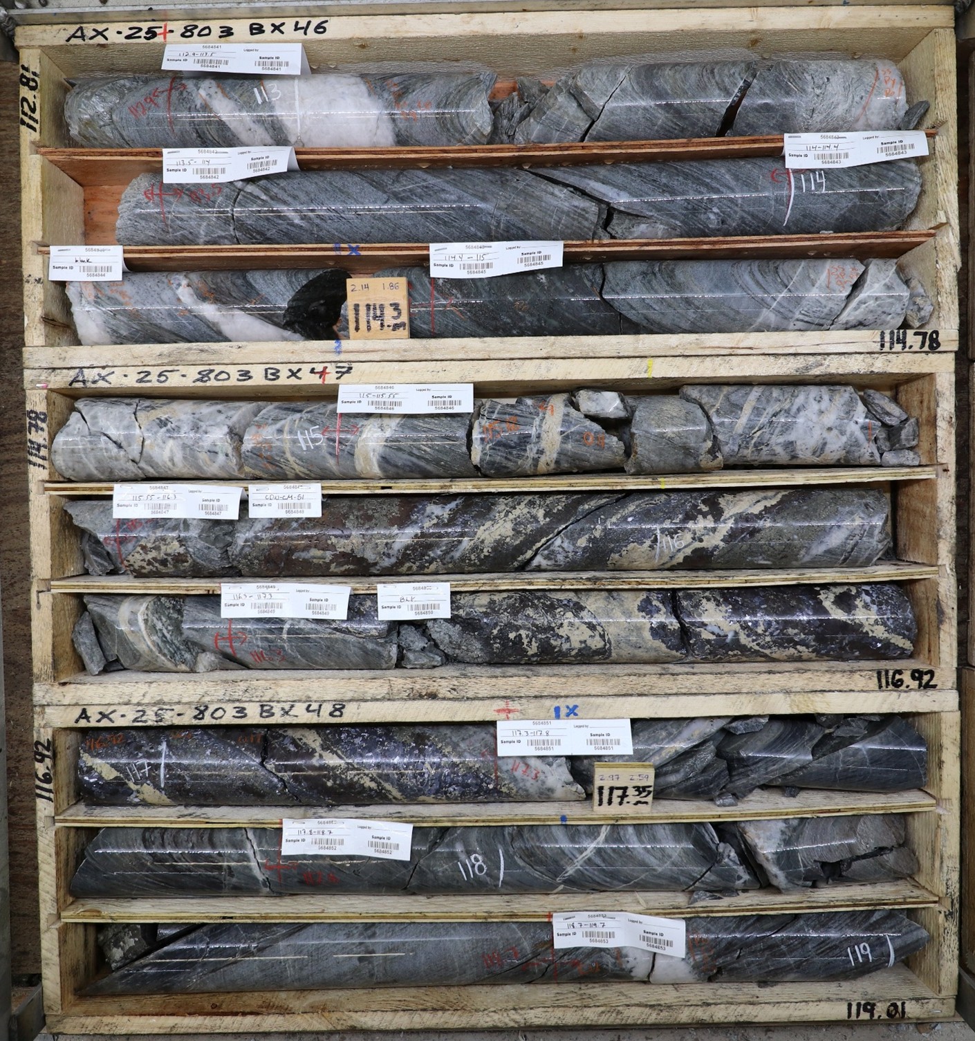 AX-25-803 was drilled 90m away from 2021’s hole AX-21-142 and intersected the vein 20m from hole 142 at a depth of 115m.