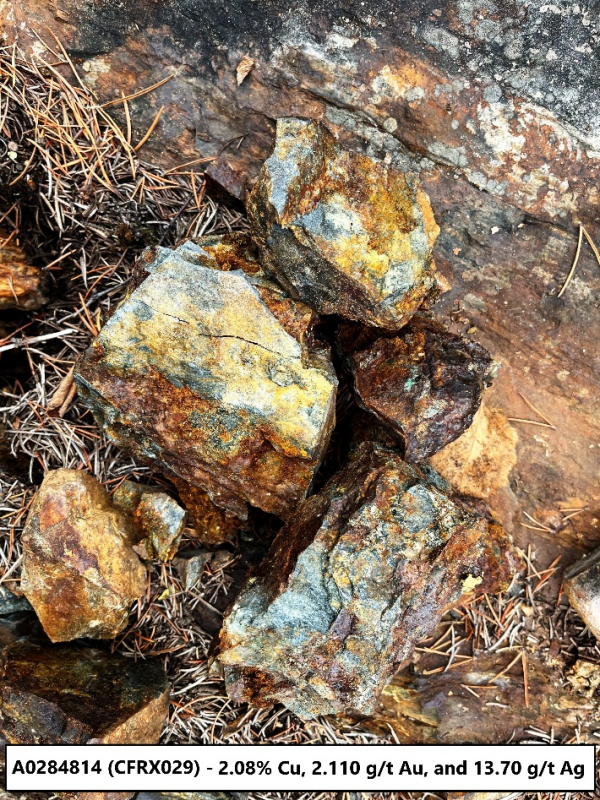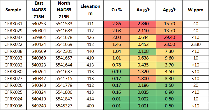 5 of the 13 grab samples assayed greater than 1% copper, while 4 of the samples assayed greater than 1.0 g/t gold, and 4 assayed greater than 10 g/t silver.
