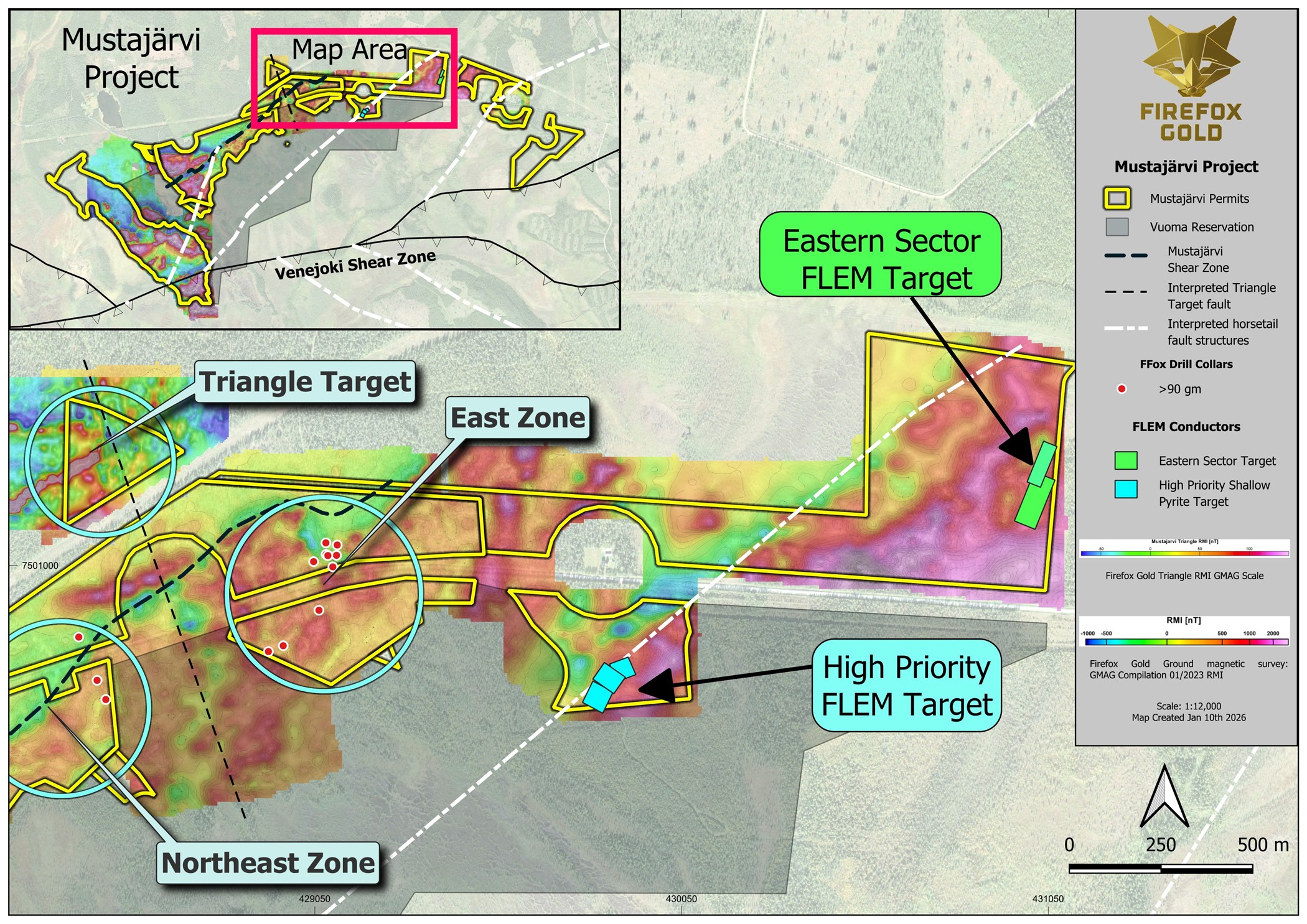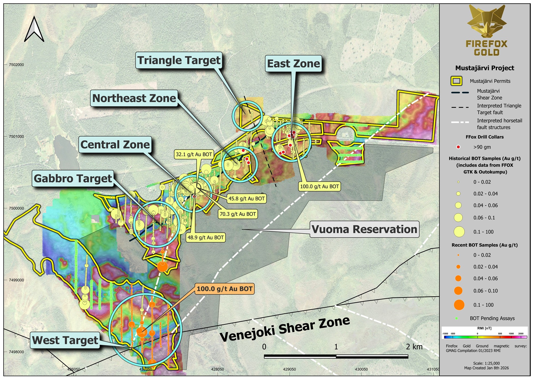 SODANKYLÄ, FINLAND / ACCESS Newswire / January 12, 2026 / FireFox Gold Corp. (TSX.V:FFOX)(OTCQB:FFOXF)(“FireFox” or the “Company”) is pleased to share an exploration update from its 100%-held Mustajärvi Gold Project in Lapland, Finland. New drill targets have emerged well away from previously reported high-grade drill results in the Northeast and East Zones. The new targets are based on new gold anomalies in base-of-till (BoT) sampling and geophysical anomalies, both of which correlate with attractive structural settings and other favourable indicators. Perhaps most significant, one new BoT sample returned more than 100 g/t gold in an undrilled area near a major structural intersection two kilometres southwest from any previous drilling. FireFox will be targeting this area and the new geophysical anomalies with new drilling as part of its ongoing Mustajärvi drill program.
