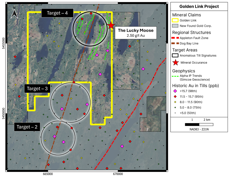 This work identified six discrete gold-in-till anomalies distributed along a ~25 kilometre structural corridor parallel to the Dog Bay Line. One of these anomalies, referred to as Target 4, lies directly within the Golden Link Project area. Target 4 was interpreted as a high-priority gold target, spatially associated with major regional structures, including the Dog Bay Line and the Appleton Linear, and supported by coincident geochemical responses from multiple sampling media (Torq Resources, 2018; Heberlein Consulting, 2018.