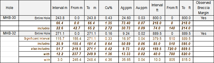 Tourmaline breccia pipes have been observed in the drill core, the historic underground workings, and outcropping at the surface (See Figures 1 and 2). High grade copper and silver values reported previously in Giant news releases are associated with these breccia pipes (See News Release’s dated May 22, 2025; September 24, 2024). The intercepts in core holes MHB-30 and MHB-32 returned high grade copper and silver as well as highly anomalous gold. The high-grade intercepts noted on Table 1 correlate with the margins of the breccia pipes.