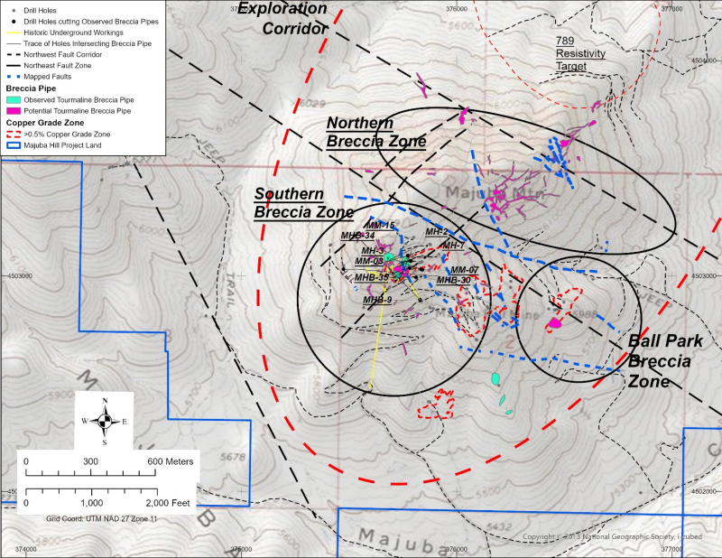 Figure 1: Majuba Hill showing Southern, Northern, and Ball Park Breccia Zones, tourmaline breccia pipes, and faulting