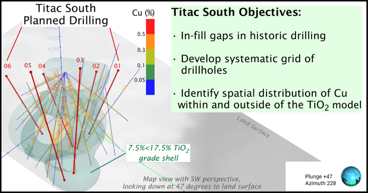 The property is 3,992 Hectares located in St. Louis County, Minnesota. Located in the Duluth Complex, the property is underlain by a thin veneer of glacial till that overlies an Oxide Ultramafic Intrusion (OUI) that is hosted within the greater mafic to ultramafic layered intrusions. The Titac South deposit contains an Inferred Mineral Resource of 46.6 Mt @ 15% TiO2 which is currently known to extend to >400m from surface, within a spherical oxide ultramafic intrusion. The extent of mineralization associated with the OUI remains open in multiple directions. Historical drill records included significant intercepts of copper, defining of which is the goal of the upcoming drill program.