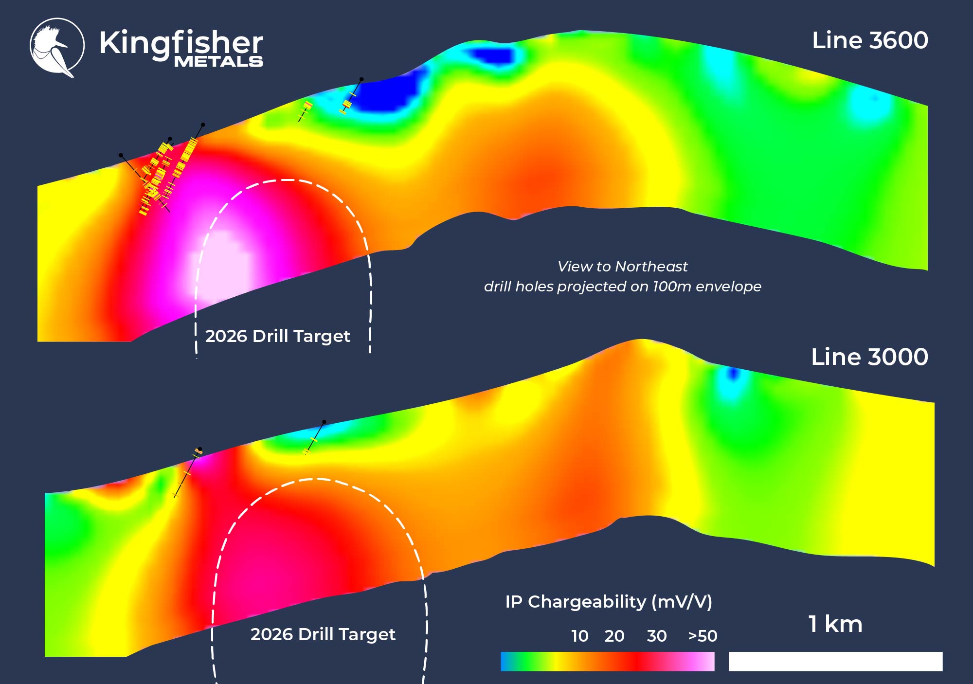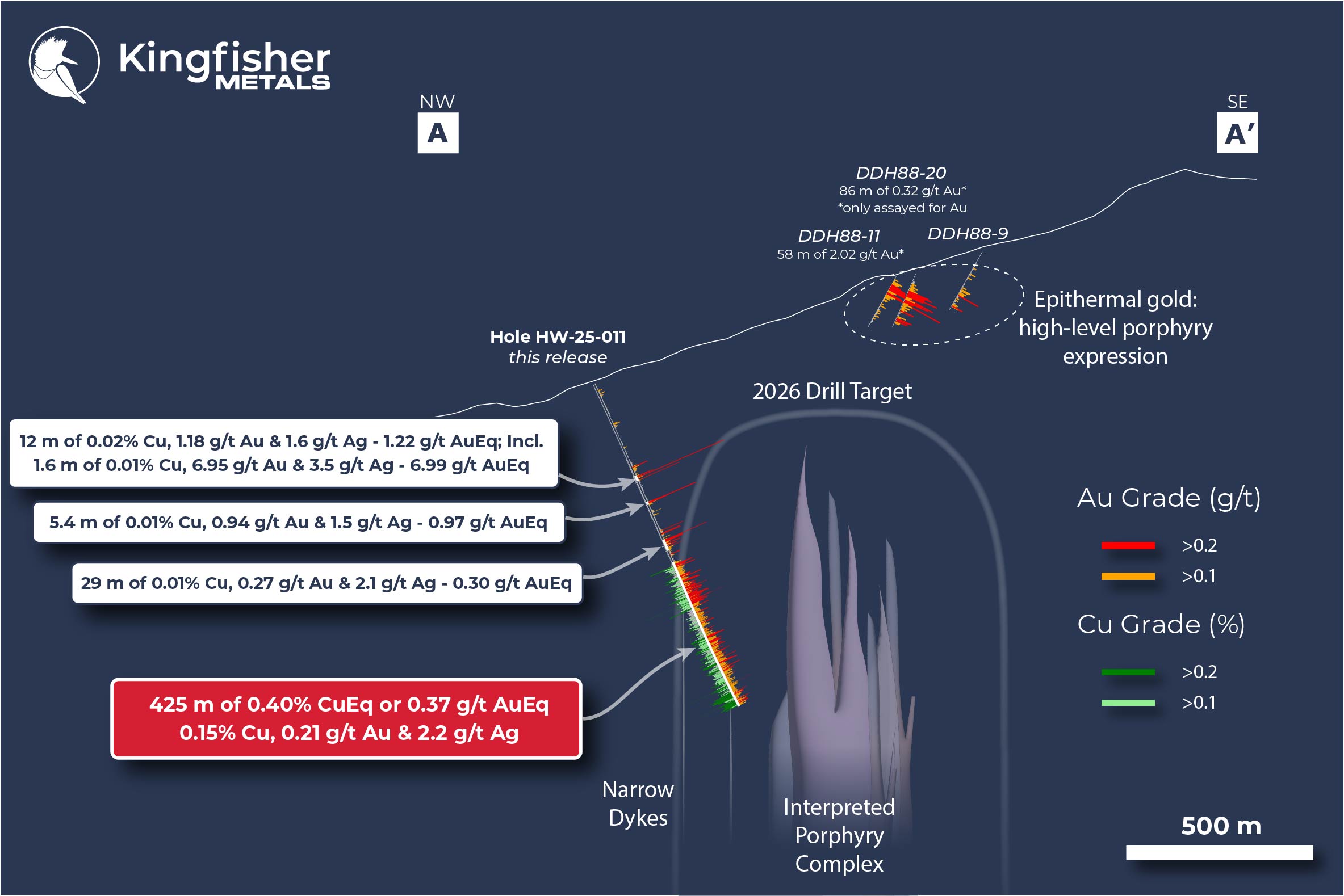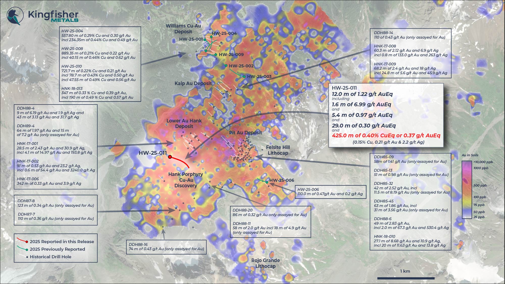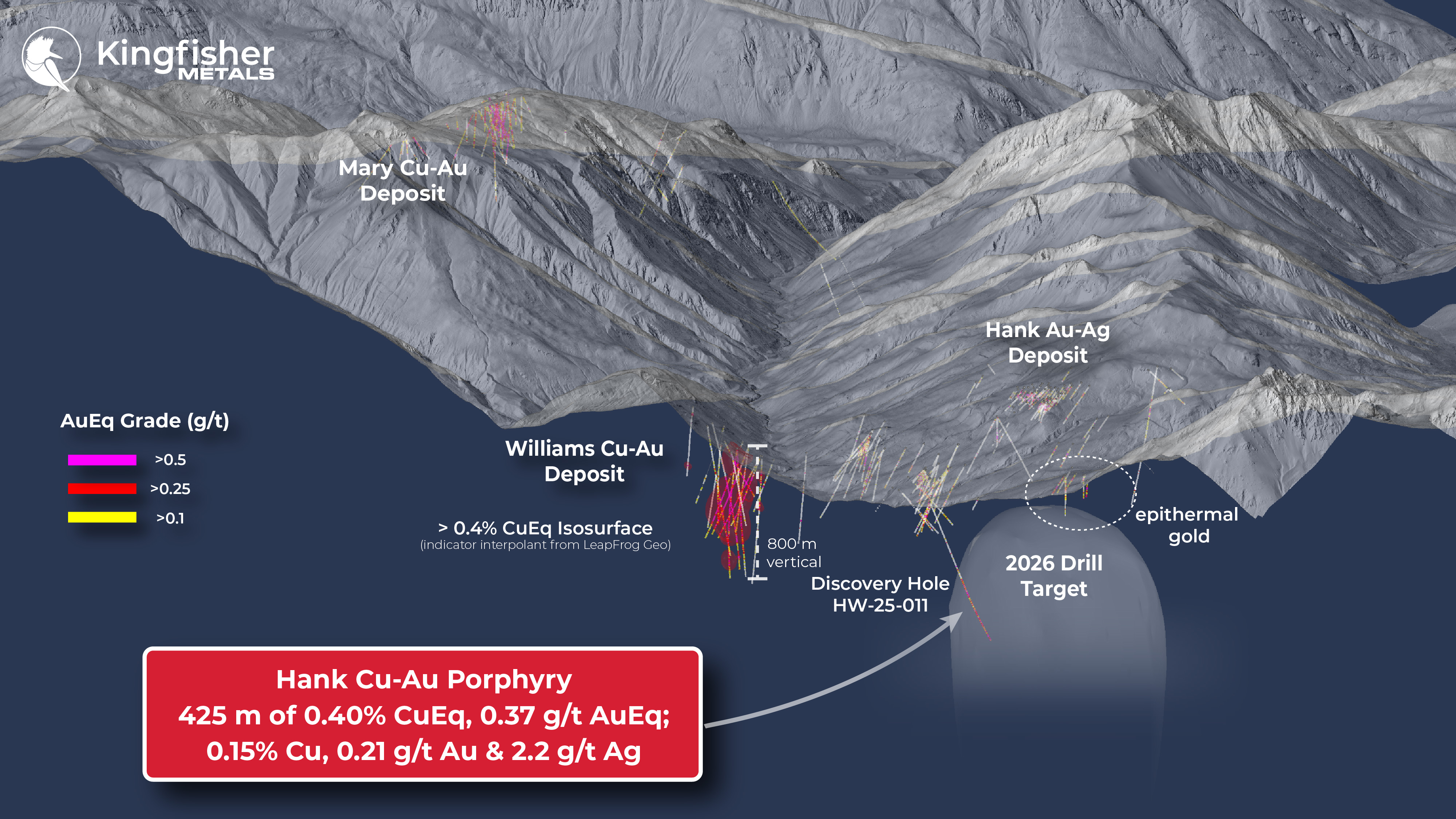 Dustin Perry, CEO of Kingfisher, states, “The final hole of the 2025 program validates our long-standing belief that the shallow Hank Au-Ag epithermal mineralization is driven by a large porphyry Cu-Au system. This impressive first intercept of 425.0 metres of 0.40% CuEq is interpreted to be on the margin of the system, with anticipated increases in grade toward the conceptual core. The scale and consistency of this discovery, along with a wide untested area hosting strong geophysical anomalies, highlight the potential for further exploration and support the need for aggressive follow-up drilling in 2026.”