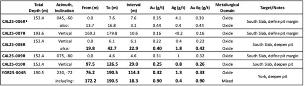 Drill holes CAL25-008R and -010R were designed to test for deeper, stacked zones of oxide gold mineralization at the south end of the Slab pit. Both drill holes successfully cut oxide gold zones with gold grades similar to that reported in this portion of the Slab pit MRE*. The other drill holes reported herein (CAL25-006R, -007R, and -009R) were needed to define the suspected limits to shallow gold mineralization along the margin and bottom of the Slab deposit and better constrain potential pit boundaries for future mine planning.