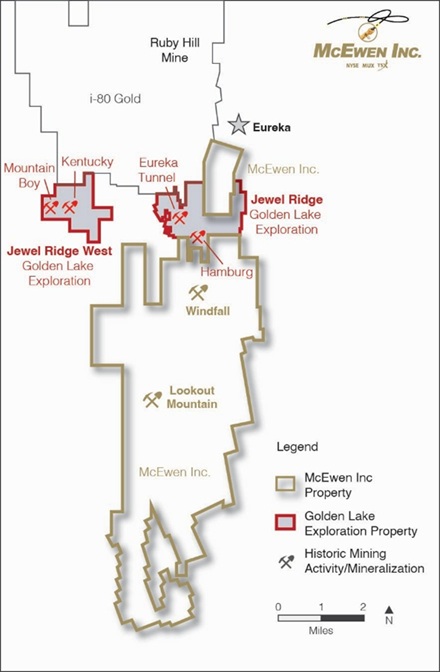 Golden Lake’s principal asset is its 100%-owned Jewel Ridge and Jewel Ridge West projects located adjacent to McEwen’s Windfall and Lookout Mountain discoveries, part of the Gold Bar Mine Complex, in the Eureka Mining District of Nevada. Historical drill highlights from Jewel Ridge project include 2.20 gpt gold over 28.96 meters, 1.24 gpt gold over 56.39 meters, 2.37 gpt gold over 67.57 meters. These holes are located north of McEwen’s Windfall deposit where a recent drill hole returned 5.55 gpt gold over 44.2 meters. Incorporating Golden Lake’s projects into the Gold Bar Mine Complex will help continue the mine’s transformation into a long-life operation by investing in exploration and leveraging the current McEwen infrastructure.