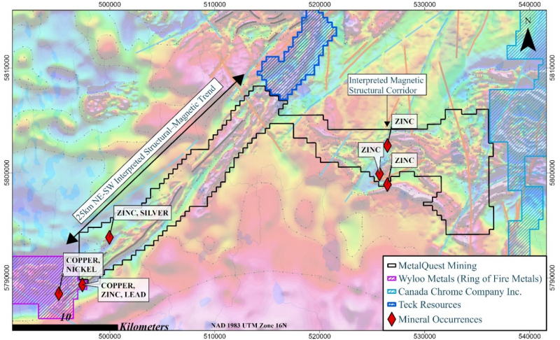 MetalQuest has staked approximately 1,094 contiguous claims covering ~22,000 hectares (54,360 acres) in the Ring of Fire region of northern Ontario.