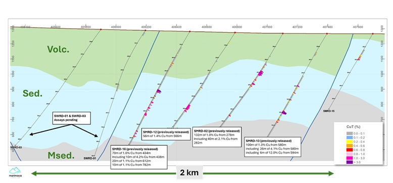 Four deep-sulphide exploration holes in the central, well defined east-west high-grade section are underway with assays pending – SWRD-01, SWRD-02, SWRD-03 and SMRD-33 (see Figure 3)
