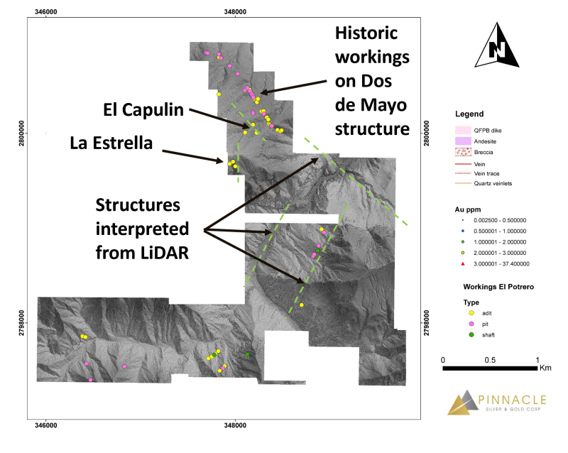 “The LiDAR survey was highly successful in confirming the 1,600 metre known strike length of the Dos de Mayo vein system and, perhaps more importantly, has identified new structures, often with artisanal workings that may indicate the presence of vein material,” stated Robert Archer, Pinnacle’s President & CEO. “The sheer number of historic shafts, adits and pits interpreted from the LiDAR survey underscores the prospectivity of the project and, to date, we have focused only on the northernmost 10% of the property. As such, we are adding to our geological team to follow up on these new targets.”