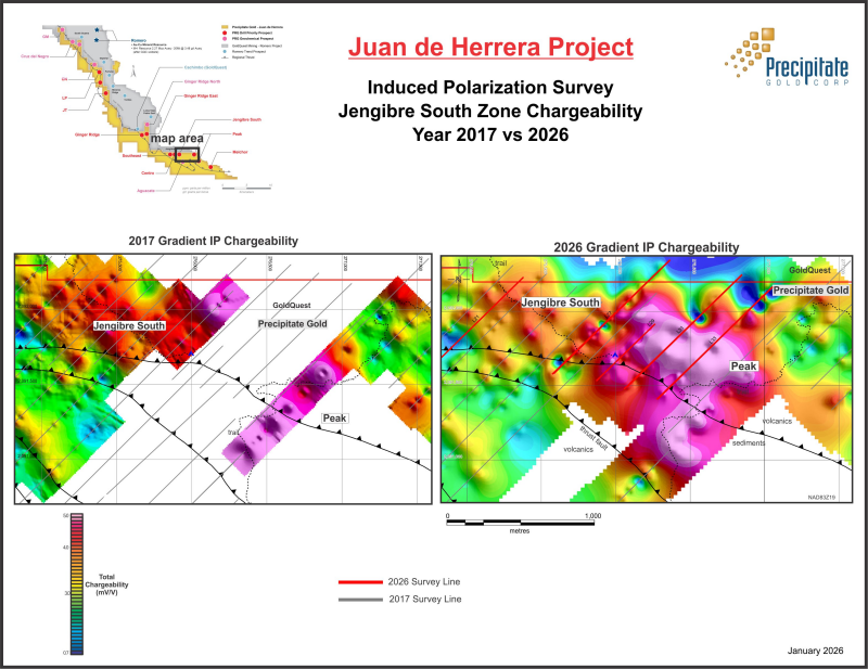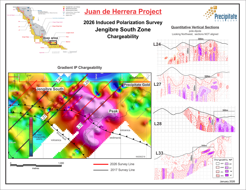 Vancouver, B.C. – January 14, 2026 – TheNewswire – Precipitate Gold Corp. (the “Company” or “Precipitate”) (TSXV: PRG, OTCQB: PREIF) is pleased to announce results from its induced polarization (“IP”) ground geophysical survey at the Jengibre South zone within its 100% owned Juan de Herrera Project (“Juan de Herrera” and the “Project”) in the Dominican Republic.