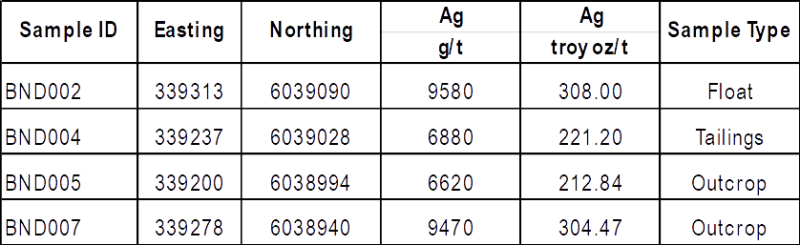 Table 1 below summarizes anomalous assay results from surface sampling.