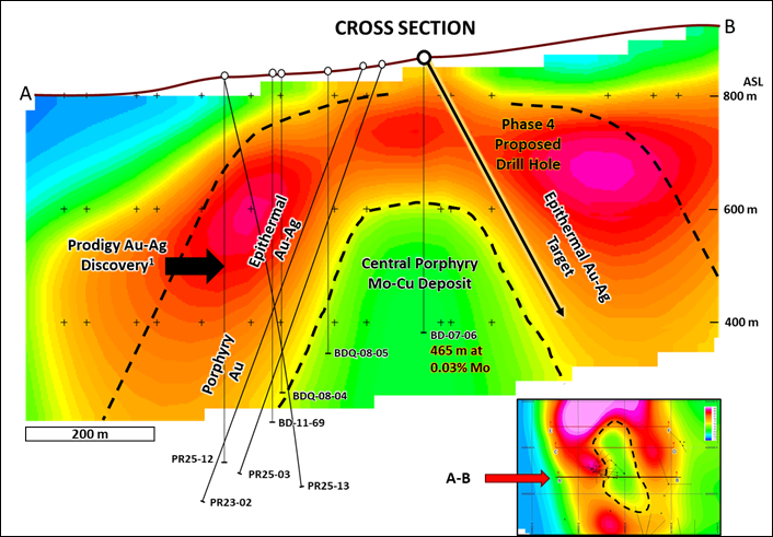 Distinct central core and surrounding sulphide halo mapped, and position of the Prodigy epithermal and porphyry gold-silver discovery defined within the overall sulphide system.