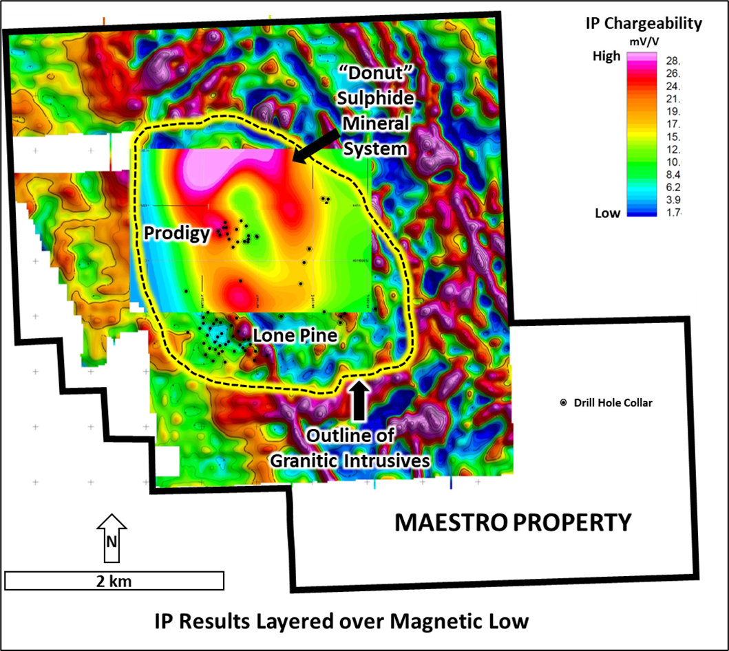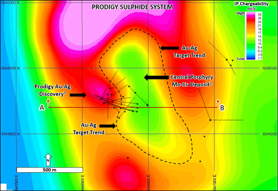 The deep sensing IP survey obtained high resolution chargeability and resistivity responses over the area proximal to the Prodigy Au-Ag discovery and the Lone Pine molybdenum deposit located one kilometer to the south. Importantly, the chargeability responses not only outlined the entire sulphide mineralized system but the specific geological environment and location of the Prodigy discovery mineralization within it (see Figure 1).
