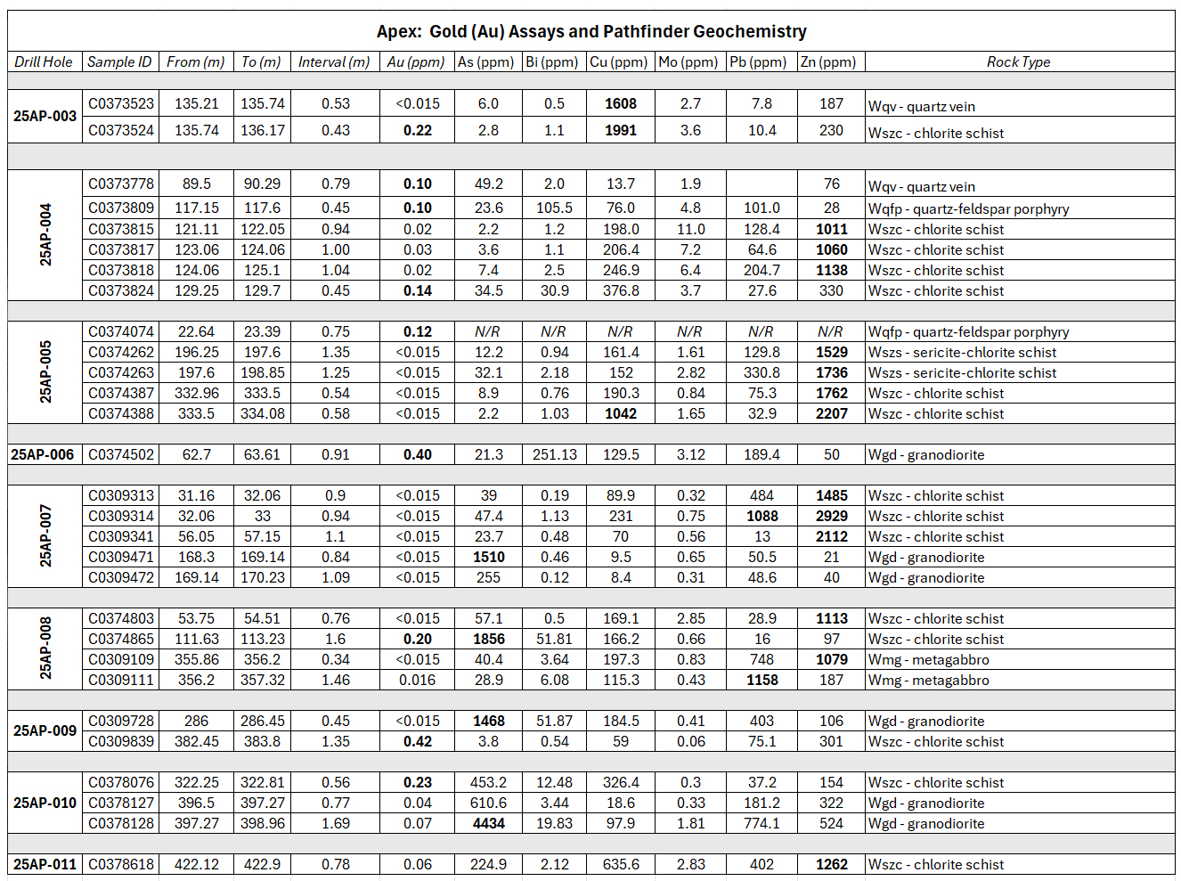 0.40 g/t Au over 0.91 m in hole 25AP‑006 from 62.70 m to 63.61 m.