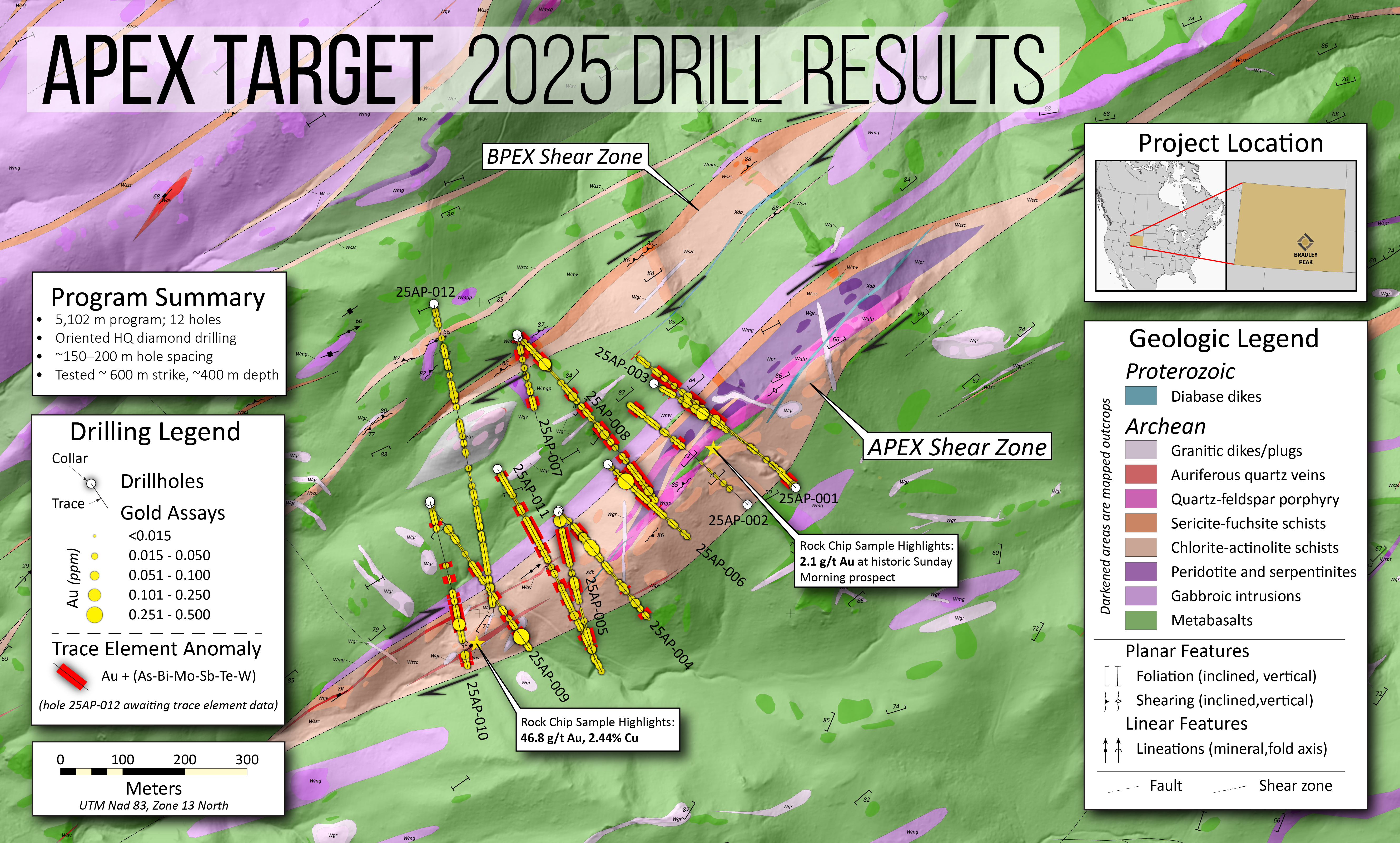 VANCOUVER, BRITISH COLUMBIA / ACCESS Newswire / January 21, 2026 / Relevant Gold Corp. (TSXV:RGC)(OTCQB:RGCCF) (the “Company” or “Relevant Gold“) is pleased to report results from its 2025 diamond drill program at the Apex Shear Target, part of the 100%-owned Bradley Peak Gold Camp in the Seminoe Mountains, central Wyoming. The 5,102 metre (m) HQ diamond core drilling program, the first ever completed at Apex, has confirmed the presence of a large, fertile Archean orogenic gold system, such as those in the Canadian Abitibi Belt, characterized by: