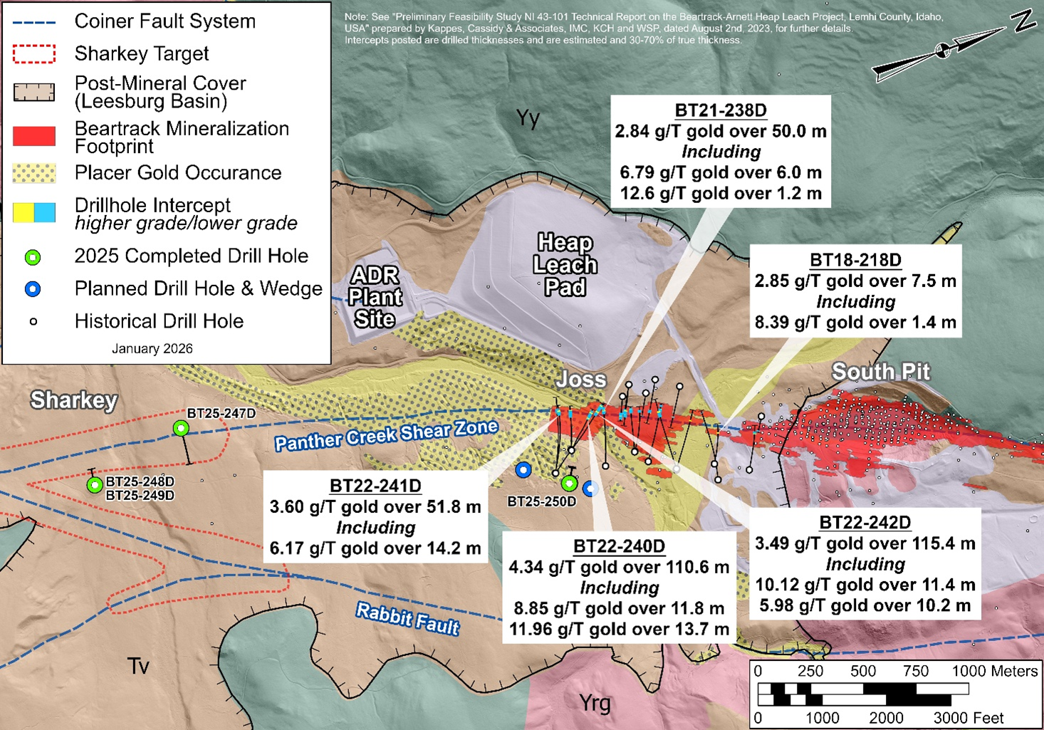 A two-kilometer step-out on the Beartrack-Arnett property at the greenfield Sharkey target; and