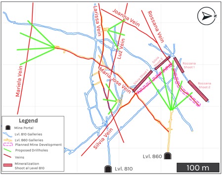 In parallel with drilling, the Company plans to initiate underground development on Level 860, located approximately 50 metres above Level 810. This development will provide direct access to the up-dip extensions of the strong mineralized shoots, allowing for additional mapping and channel sampling.