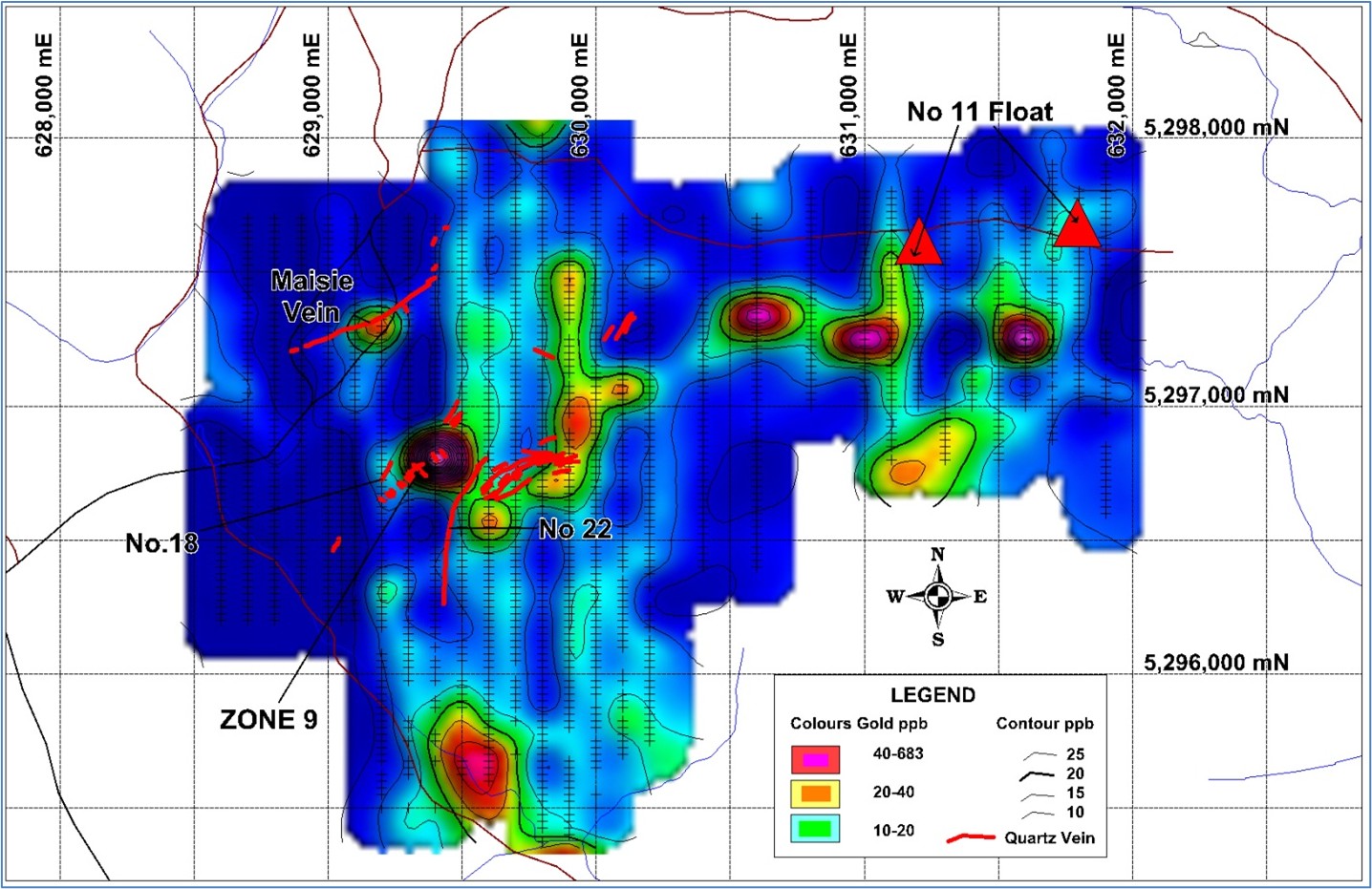 Gold soil anomalies are widespread across the Menneval soil grid, as illustrated in Figure 1. There is a strong spatial association between the gold soil anomalies and known quartz veins previously discovered by SLAM.