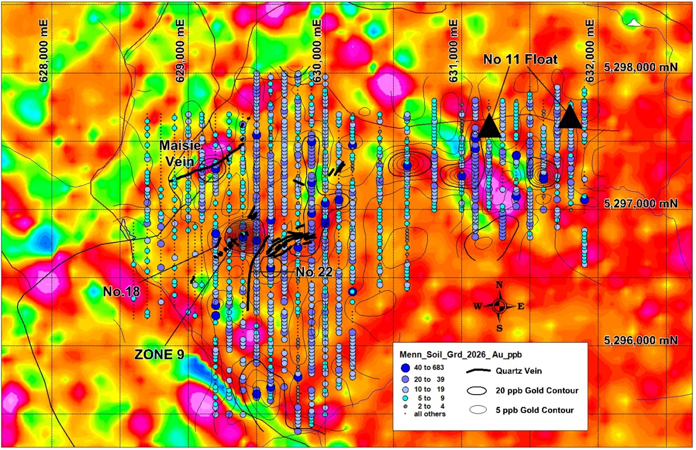 Director Jacques Turcotte stated: “Wow! Eighty percent of these samples contain gold as seen by the number of coloured dots. These beautiful maps show us the exceptional gold potential of Menneval. The blue dots show high gold lining up along aeromagnetic features and define exceptional drilling and trenching targets for upcoming 2026 campaign. Along with our known high grade gold veins open at depth and along strike these are high priority gold targets. The 2026 Menneval drilling program will be very exciting!”