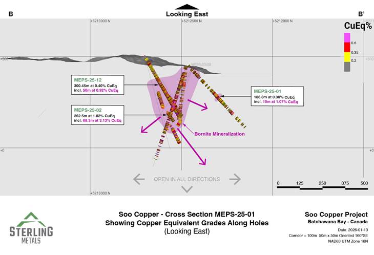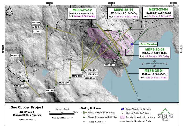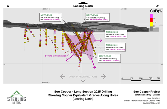 TORONTO, ON / ACCESS Newswire / January 15, 2026 / Sterling Metals Corp. (TSXV:SAG)(OTCQB:SAGGF) (“Sterling” or the “Company”) is pleased to report new assay results from its expanded and completed 2025 drilling program at the Soo Copper Project (“Soo Copper” or the “Project“) located near Batchewana Bay, Ontario. These new results continue to expand a continuous zone of porphyry copper mineralization first highlighted earlier last year in MJ-25-01 which was later found to contain very high-grade bornite mineralization as previously reported in discovery hole MEPS-25-02 (see press release dated September 29, 2025).