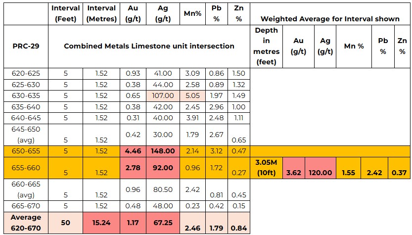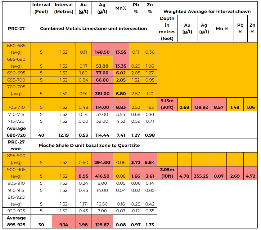 including 10 feet (3.05 metres) at 120.00 g/t Ag, 3.62 g/t Au, 1.55% Mn, and 2.42% Pb.