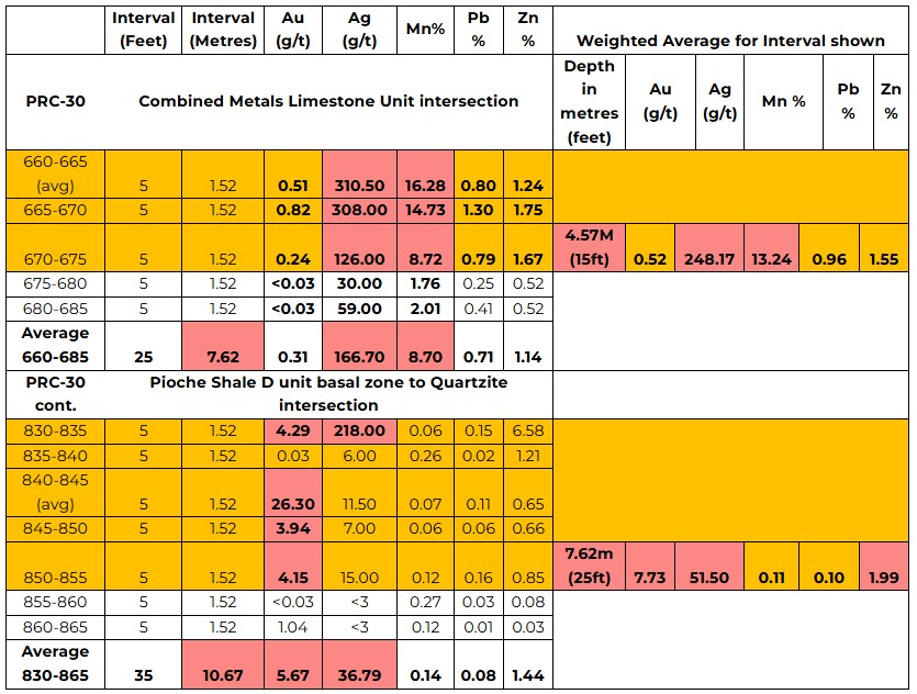30 feet (9.15 metres) at 139.92 g/t Ag, 0.68 g/t Au,8.57% Mn, 1.48% Pb, and 1.06% Zn; and