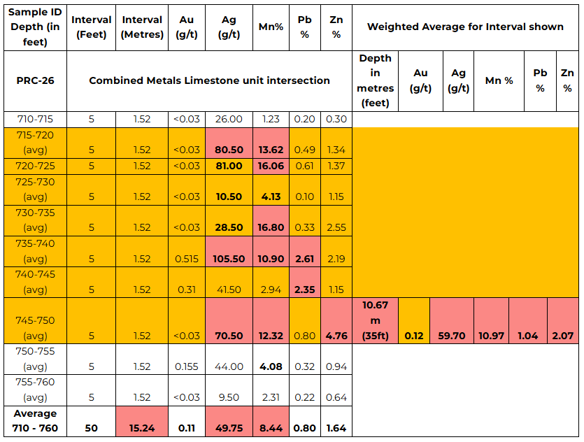 35 feet (10.7 metres) at 59.7 g/t Silver (Ag), 0.12 g/t Gold (Au), 10.97% Manganese (Mn), 1.04% Lead (Pb), and 2.07% Zinc (Zn).