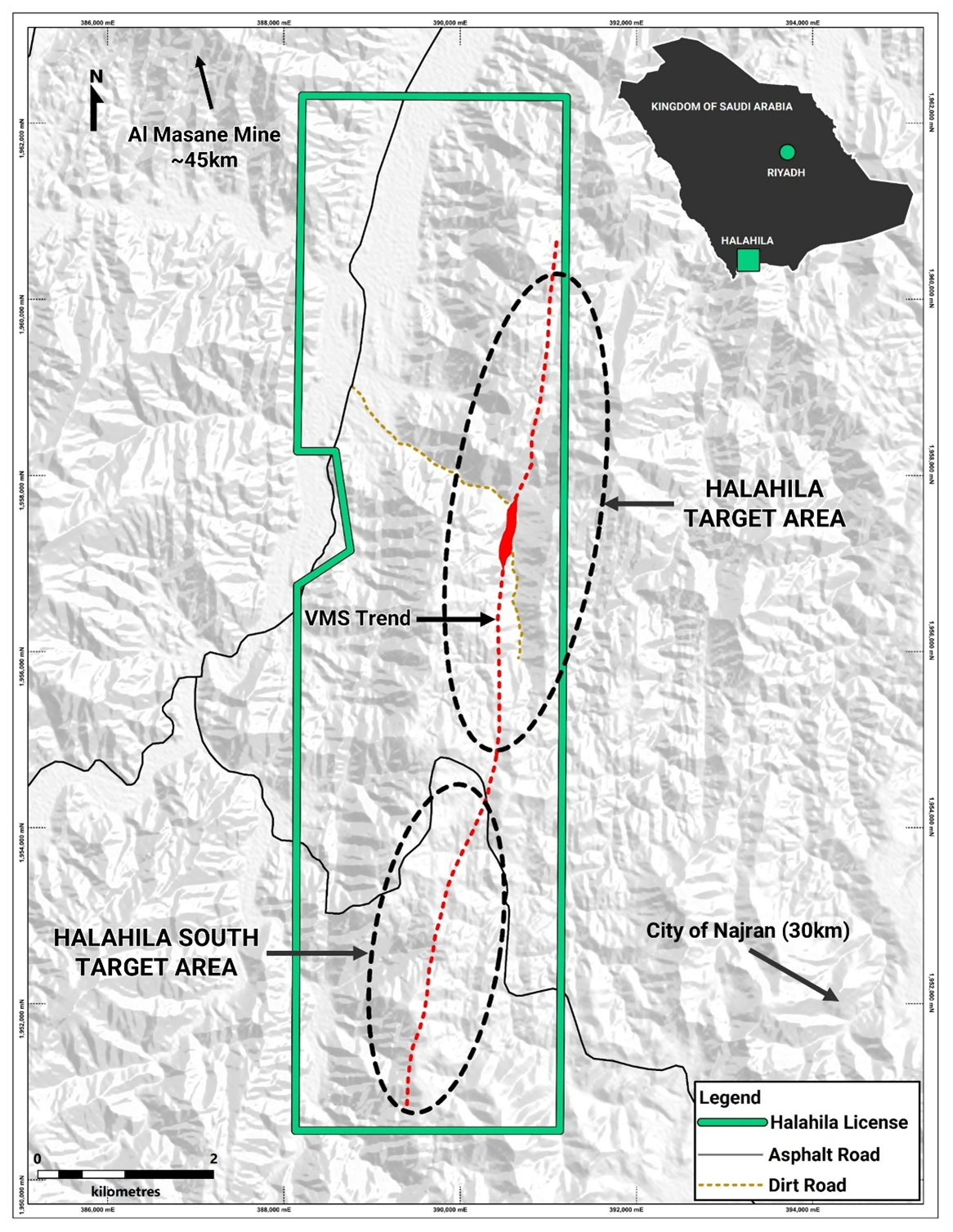 The 35 km² Halahila Project is situated within the highly prospective Kutam-Al Masane VMS Belt of the southern Asir Terrane in Saudi Arabia. The district hosts several VMS and gold deposits, including the Al Masane copper-zinc mining complex, located 45 km to the north, and the ancient historic Kutam copper mine, located 40 km to the west of Halahila.