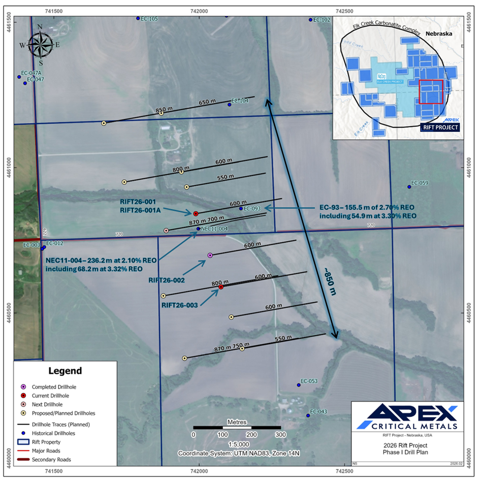 VANCOUVER, BC / ACCESS Newswire / February 10, 2026 / Apex Critical Metals Corp. (CSE:APXC)(OTCQX:APXCF)(FWB:KL9) (“Apex” or the “Company”), a Canadian mineral exploration company focused on the identification and development of critical and strategic metals, is pleased to announce that its Phase I drill program is fully mobilized, with two drill rigs now active at the Company’s 100%-controlled Rift Rare Earth Project, located within the Elk Creek Carbonatite Complex in southeastern Nebraska, U.S.A.
