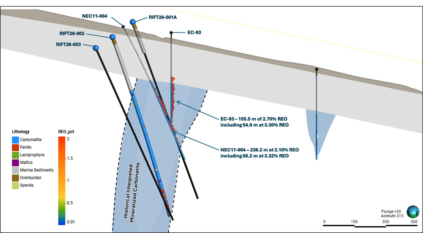 Drill hole RIFT26-002, collared approximately 100 metres (“m”) south of historical hole NEC11-004 intersected carbonatite over an approximately 330 m interval starting at 178 m downhole and extending through the interpreted mineralized zone (see Fig 1 and Fig 3)