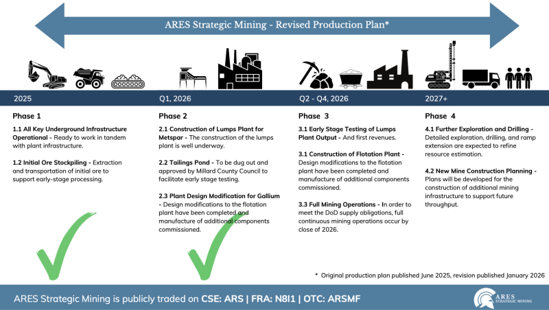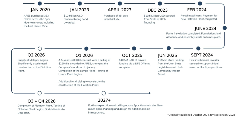 Vancouver, B.C., February 5, 2026 – TheNewswire – Ares Strategic Mining Inc. (CSE: ARS) (OTC: ARSMF) (FRA: N811) is pleased to announce an expedited roadmap to the production of acidspar. The initiative will include an acceleration of the planned expansion of mining activities at the Spor Mountain, as well as fast tracking the construction of the flotation plant so the Company can produce acidspar to meet its Pentagon contract obligations. This initiative will include imminent drilling activities to expand mining targets and the number of mines available to Ares, as well as bringing in crews to ensure Ares can produce the highest grade fluorspar products in 2026.